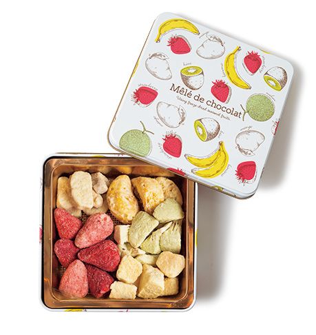 「華やかな見た目と美味しさに衝撃を受けました(onKuL 出版元 齋藤さん)」。フリーズドライしたフルーツにチョコレートを染み込ませた、サクッ、ホロッとした口当たり。口の中でチョコレートがじゅわっと広がる。1 缶 ¥3,078~