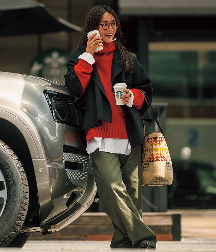 ストール付きコート¥154,000(デパリエ/デパリエ 伊勢丹新宿店)ニット¥19,800(フレームワーク/フレームワーク ルミネ新宿店)シャツ¥39,600(カオス/Chaos GINZA SIX)パンツ¥35,200(ダブルスタンダードクロージング/フィルム)バッグ¥63,800(ア ヴァケーション/ノーベルバ)ローファー¥11,500(CHARLES & KEITH)眼鏡¥17,600(ランバン オン ブルー/デリーゴジャパン)リング[左手]¥93,500(アナプノエ/フォーティーン ショールーム)リング[右手]¥41,800(リューク)