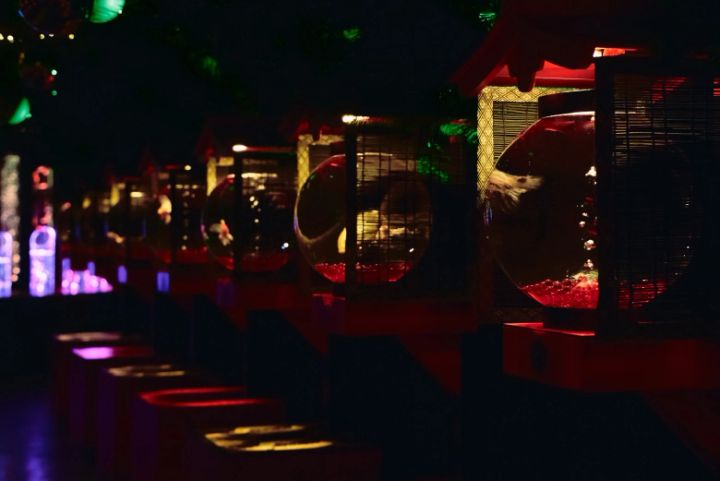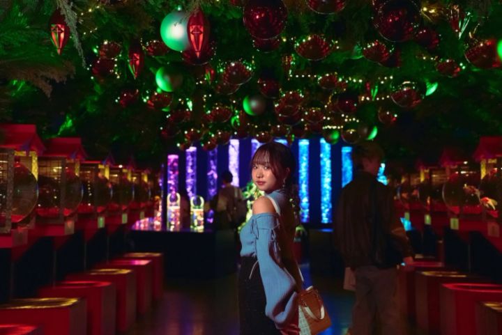 提灯に見立てた水槽が並ぶ空間を、クリスマスのイルミネーションでデコレート。