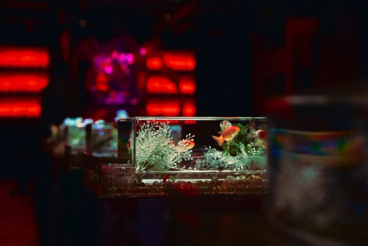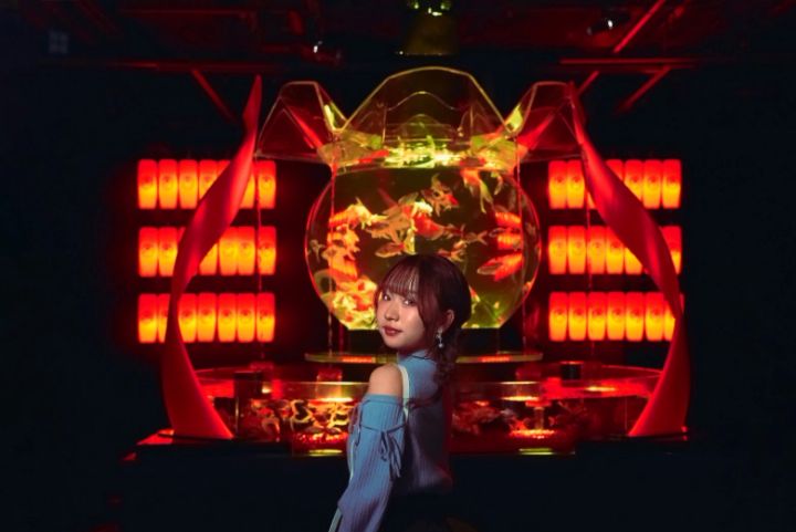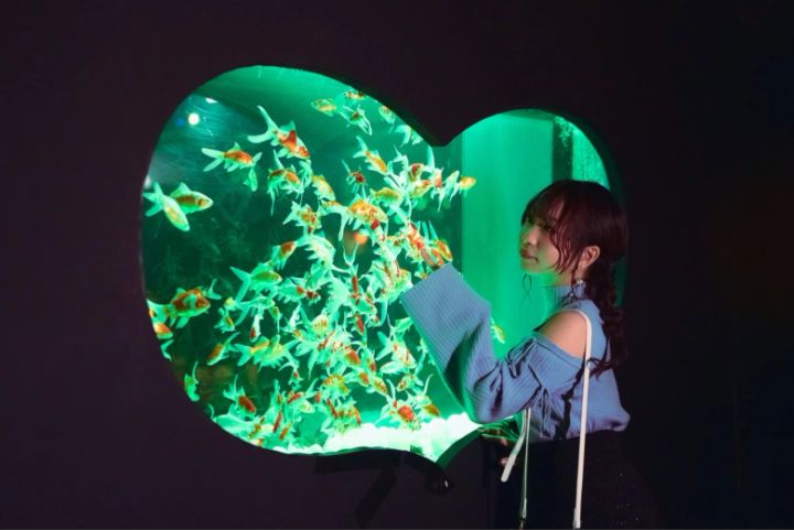 水と光の泡の柱のなかで、金魚たちが乱舞しています。うえきあやかさんのいちばんのお気に入りスポットでした。