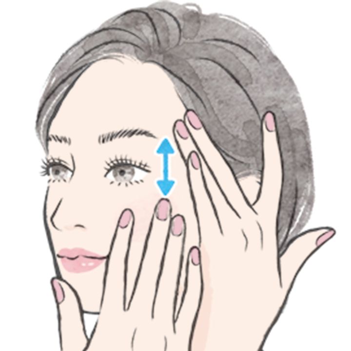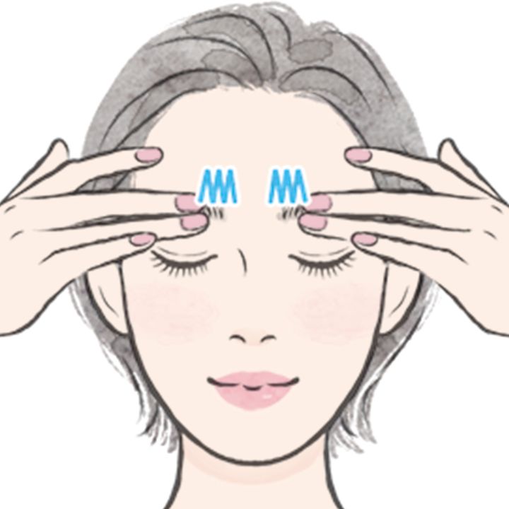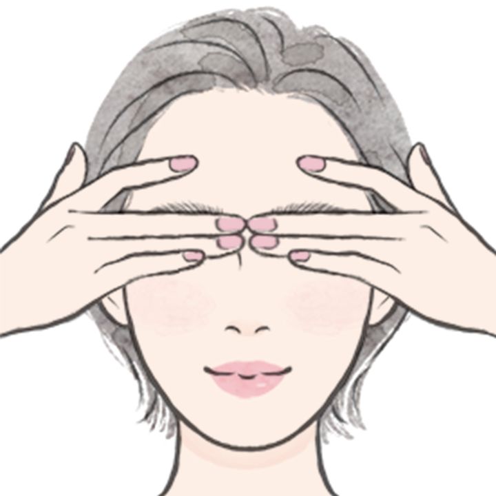 ③片手の中指と薬指でこめかみの部分を軽く押さえ、もう片手の中指と薬指で目尻のあたりを優しく上下に動かしてマッサージ。やりすぎないように注意を。