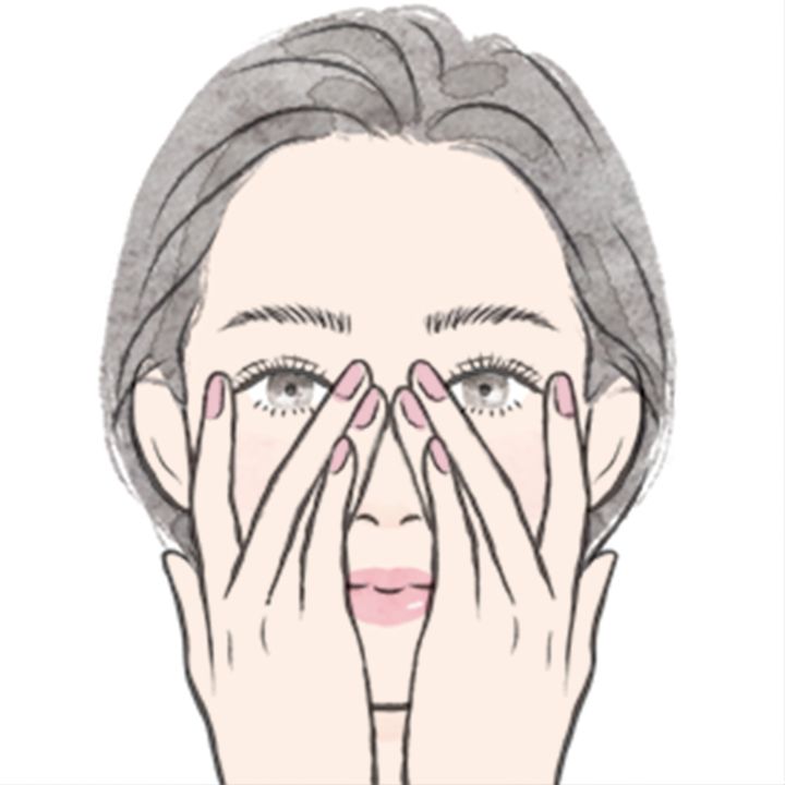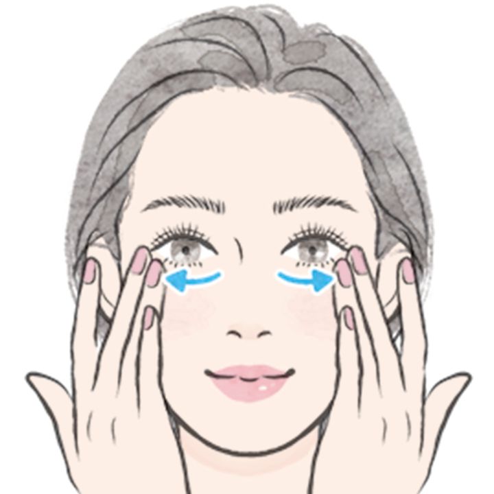 ①適量のクリームを目の際を避けて目の周りを囲むようにすべらせます。中指と薬指を使いましょう。中心から外側に向かって、が基本。