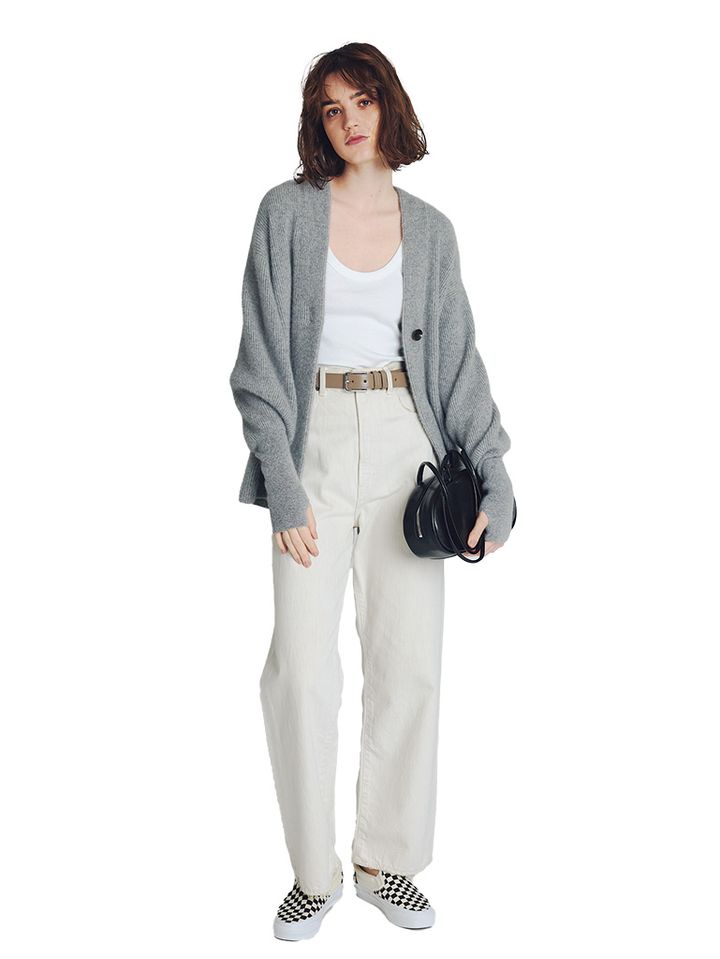 【POINT】無彩色でまとめた全身になら、小さなベージュや黒でも差し色として十分効果的。派手な色を使わずとも引き締まる、地味とは違った配色バランス。
