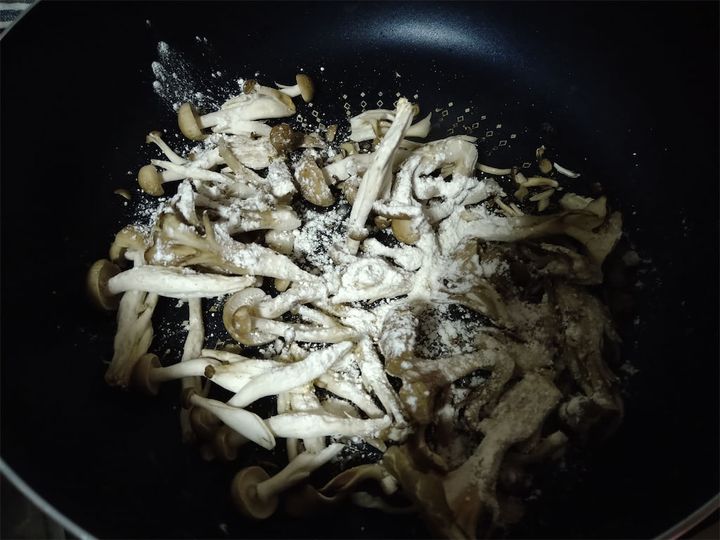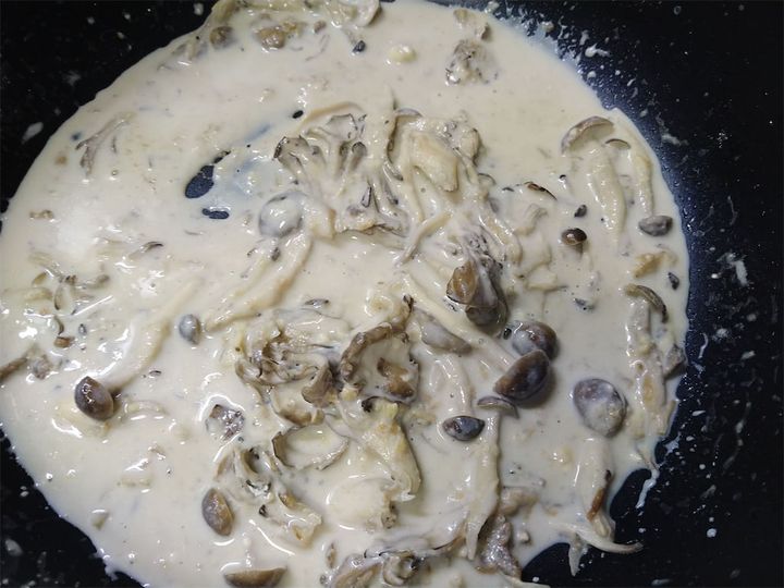 4.フライパンにオリーブオイル小さじ1を引き、3のきのこを炒めて小麦粉を加える。小麦粉が全体に馴染んだら、豆乳を加えてとろみが付くまで混ぜながら加熱する。
