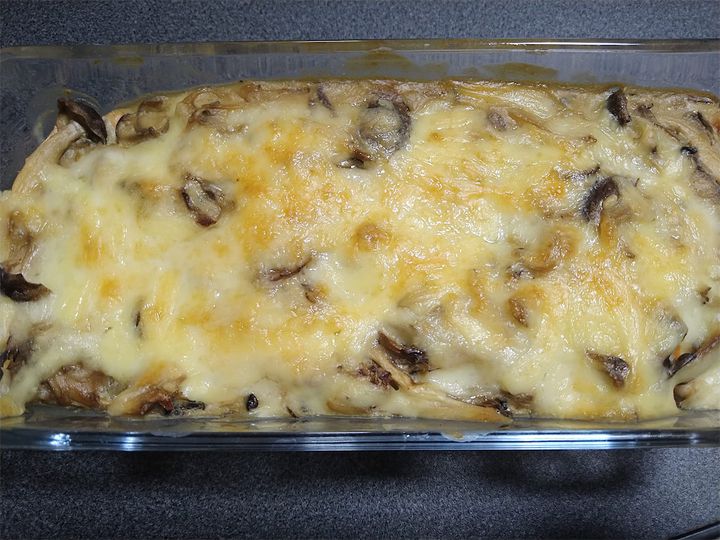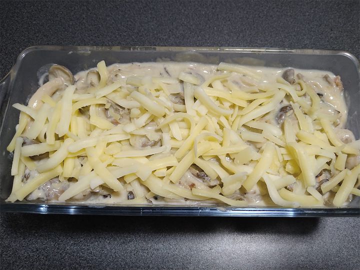 6.その上に4のホワイトソースをかけて、最後にチーズをのせる。オーブントースターで焼き色が付くまで10分ほど加熱する。