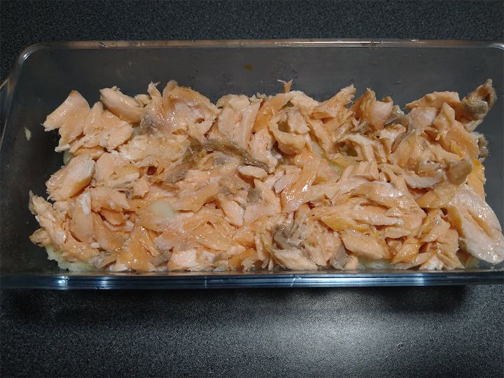 5.耐熱容器に2のじゃがいもを入れて、ほぐした鮭をのせる。