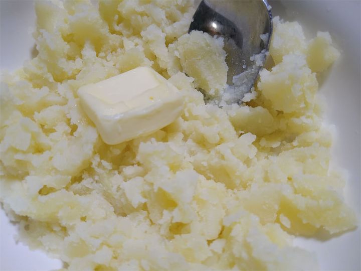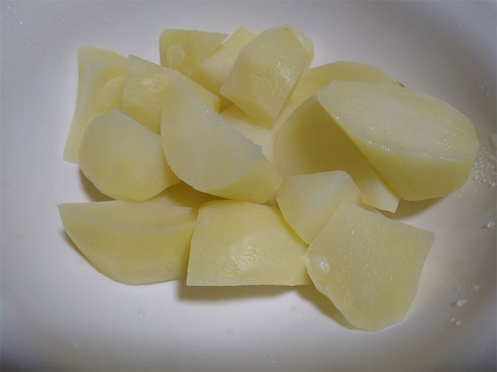 2.じゃがいもは皮を剥いて、電子レンジ600Wで5分程加熱する。加熱後は1/4くらいの大きさに切ってつぶす。そこにバターを加えて、塩、こしょうで味を調える。