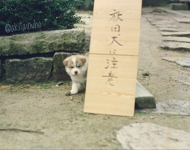 3. かわいすぎて危険!?「秋田犬に注意」と書かれた看板の横には可愛すぎる子犬がひょっこり