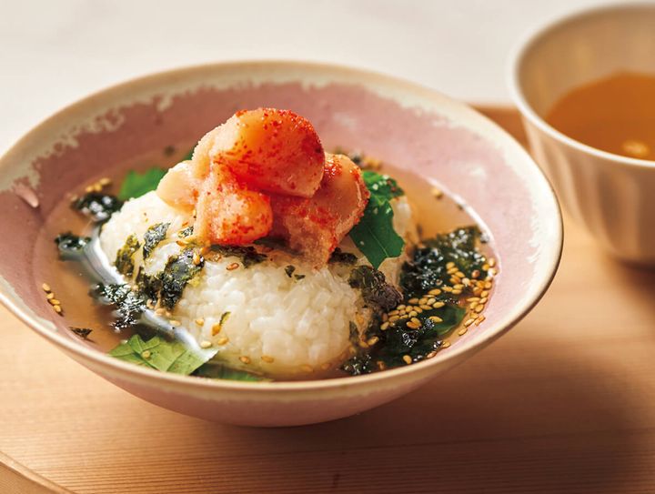 シンプルな具材だけでも満足感を与えてくれるだし茶漬け。だしとともにふわっと香る大葉とのりの風味が繊細で上品。明太子がなければ、塩昆布や梅、鮭フレークでもOK!