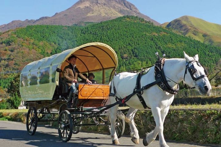 全国的にも珍しい、公道を馬車で巡る体験。愛らしいお馬さんがひく辻馬車は運行50周年。ゆったりと揺られながら、由布院の自然を感じて。