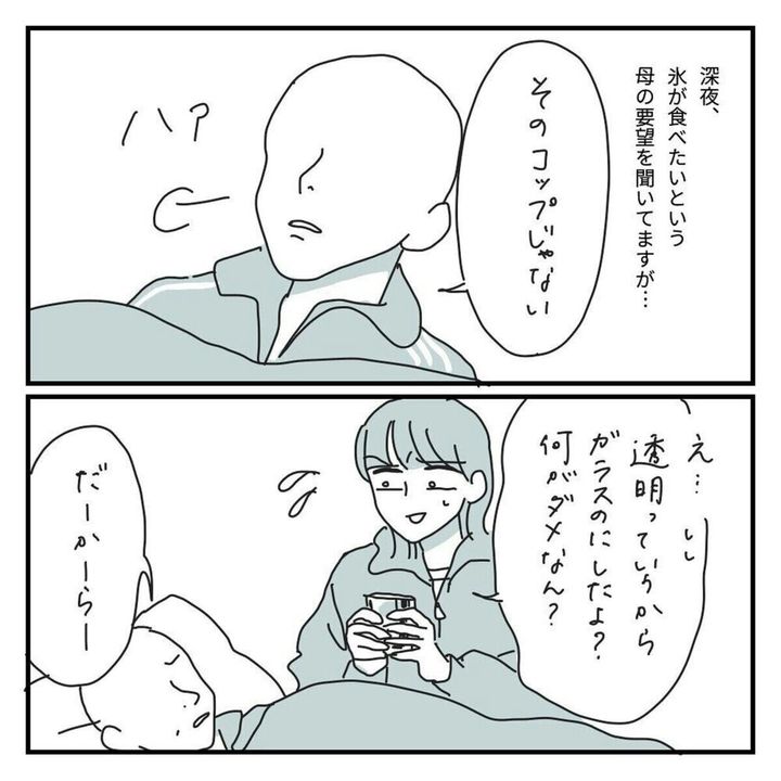 深夜に「氷が食べたい」と訴える母。ところが、何度も母に「ちがう」と言われてしまいます。母が求めていることとはいったい?