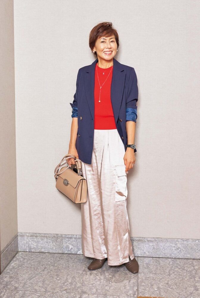 「ジル バイ ジルスチュワート」のカーゴパンツに「来年、還暦なので赤のトップスを合わせました(笑)」と話すのは、澤 菜央子さん。ジャケットの袖のまくり具合といい、こなれた着こなしは、まさにスマートカジュアル!