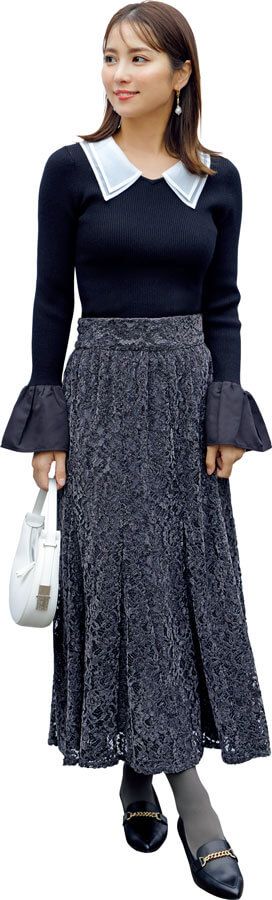 えり付きニット×レーススカートで上下ブラックでも大人可愛く