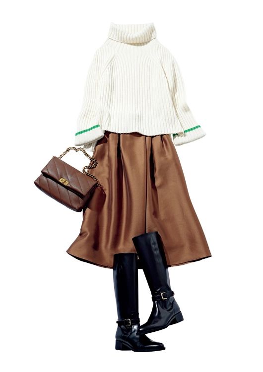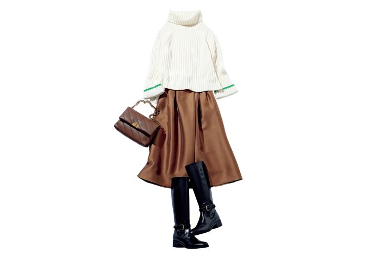 ラインタートルニット¥33,000/yori ふんわりスカート¥25,300/ジャスグリッティー キルティングバッグ¥17,050、ロングブーツ¥39,600/ダイアナ(ダイアナ 銀座本店)