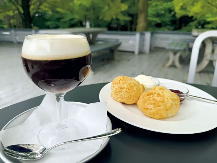 ラズベリージャムとクロテッドクリームを塗って、「スコーンセット」(¥1,250)の「アイリッシュ珈琲」と頬張れば、気分はもう那須のマダム!(タカクラ)