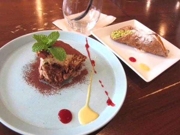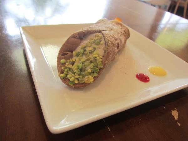 カンノーロ。パイ生地に羊のリコッタチーズを使ったシチリアのドルチェです。ナッツやチョコや柑橘がトッピングされていて、美味しいアクセントになっていました。