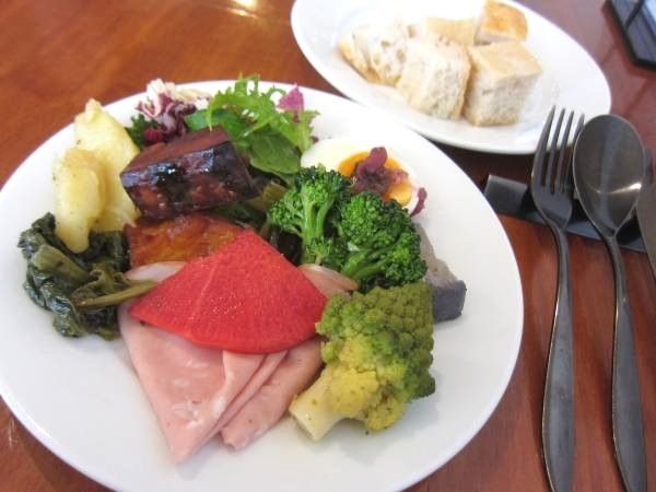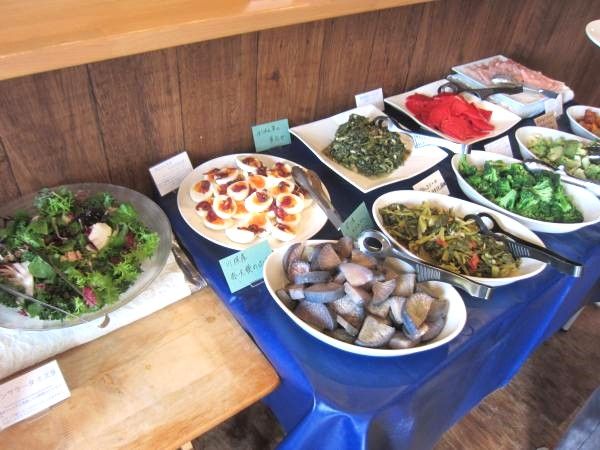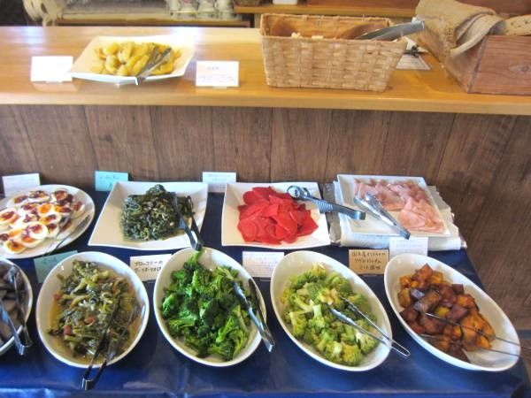 サラダバーは、セルフで取りに行きます。お野菜・お料理ごとに産地の書かれたラベルがあります。彩り豊富でキレイ~、美味しそう~。