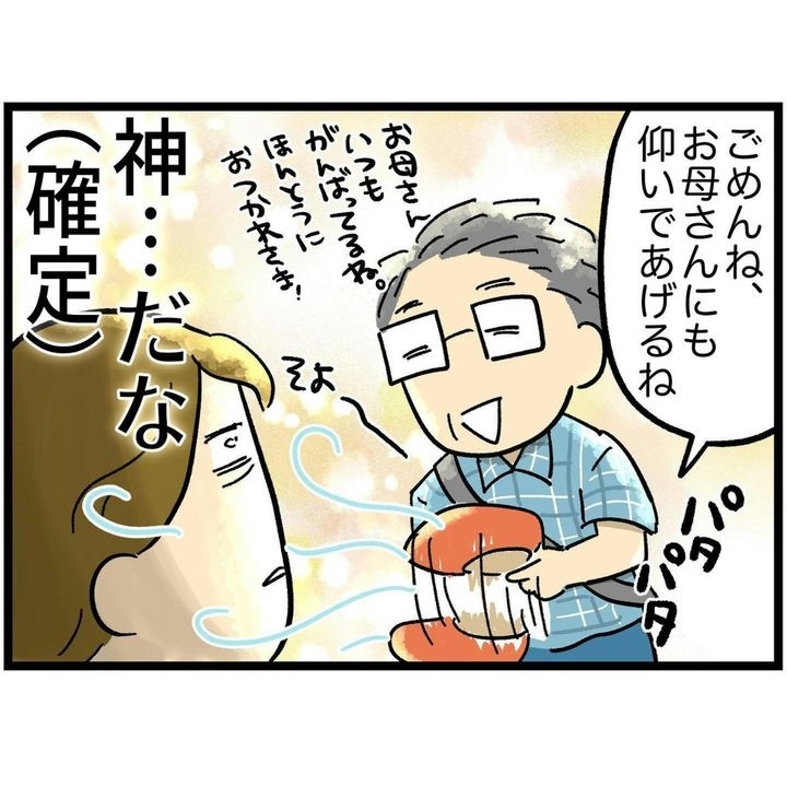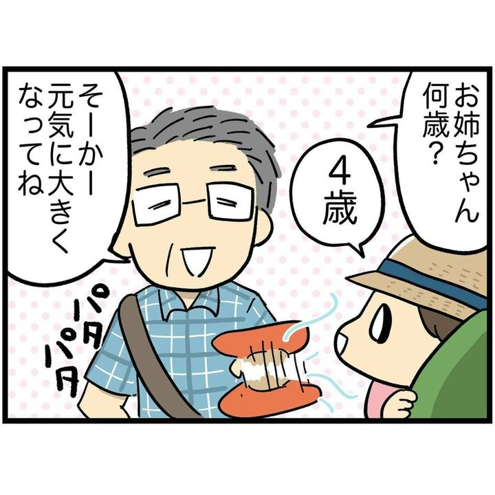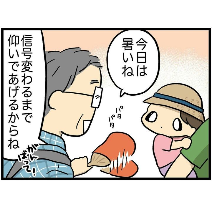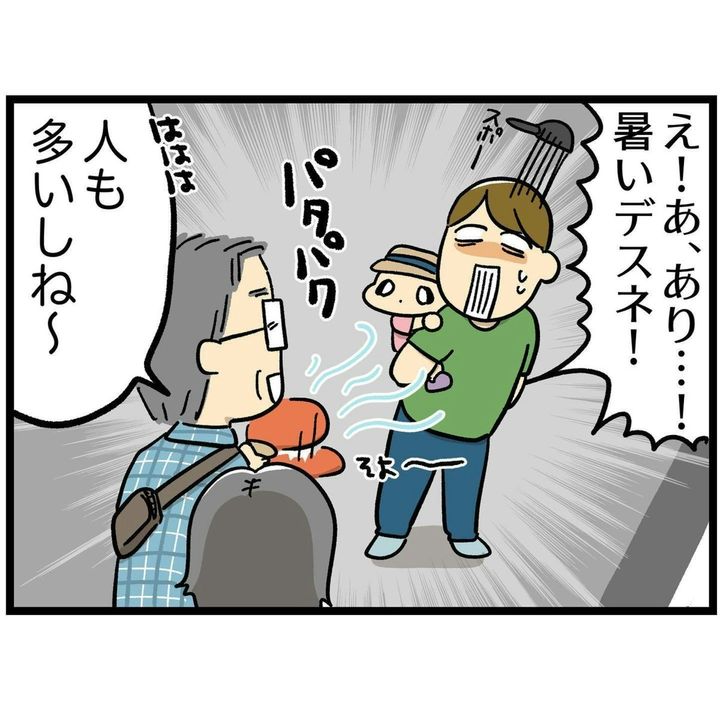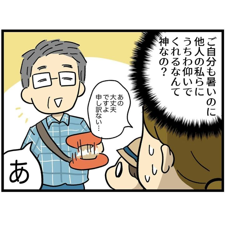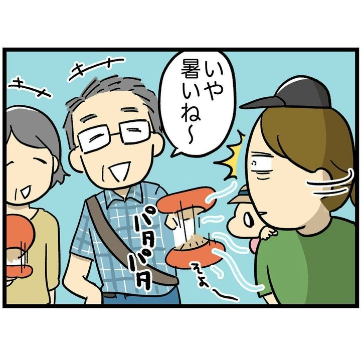 きっとご自身も暑い中、娘さんをうちわであおいでくれた男性。遠慮するもすさんも仰いでくれたうえに、「お母さんいつもがんばってるね、ほんとうにおつかれさま!」と、いたわりの言葉まで!きっとこの方は、神ですね。