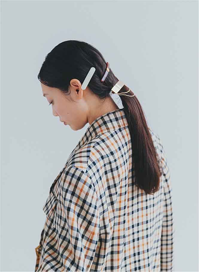 バレッタ(ゴールド)¥3,960、バレッタ(べっこう)¥2,640/共にmuku(アンティローザ)、ジャケット ¥85,800、シャツ ¥55,000、パンツ ¥52,800/すべてCULLNI DAKS LONDON(CULLNIFLAGSHIP STORE)、その他ヘアアクセ/スタイリスト私物