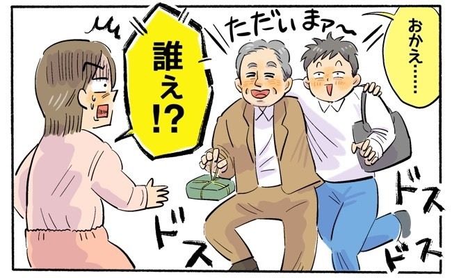 すると突然ガチャッと玄関を開ける音がし、彼が帰ってきたことがわかりました。「おかえり」と私が玄関に行くと……そこには見知らぬおじさんが。彼と一緒にニコニコしながら家に入ってきたのです。