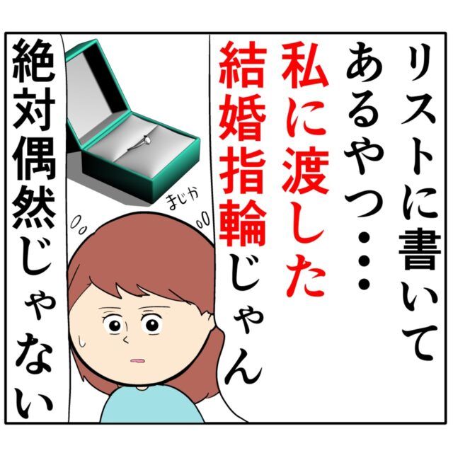 「リストに書いてあるやつ・・・私に渡した結婚指輪じゃん。絶対偶然じゃない」めいさんがろみ緒さんからもらった結婚指輪は、『ジュリ実が欲しがってた指輪』と書かれていたものと同じものだったのです。
