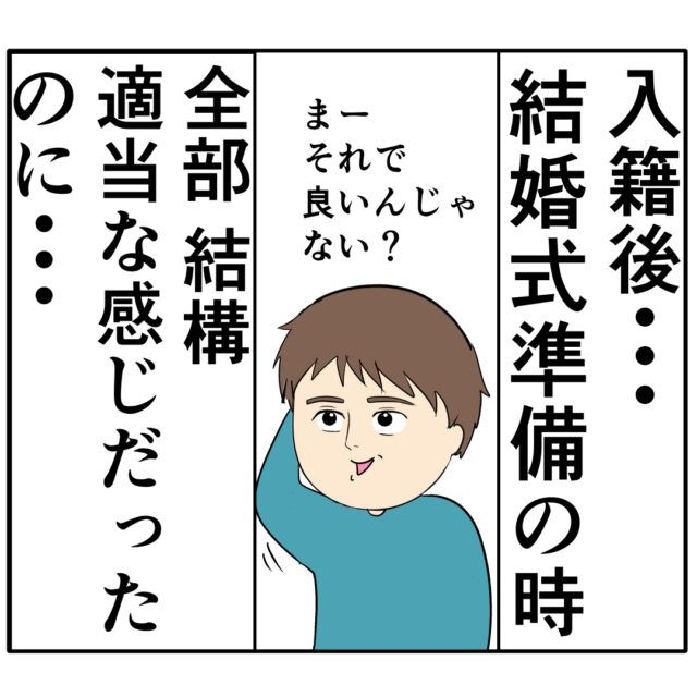 入籍したときのことを思い返すめいさん。結婚式準備のとき、ろみ緒さんは「まーそれで良いんじゃない?」と全てにおいて適当な感じでした。