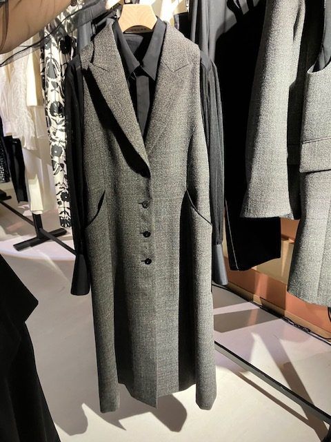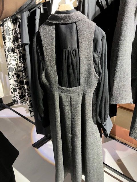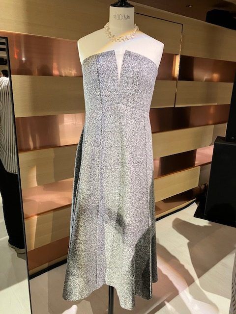 ひときわ目立っていたのが、美しいシルエットかつグレーのやわらかで上品なベアワンピ。胸元には滑り止めがついているのでズレ落ちる心配もないです。季節が進むと、シャツに重ねてもタートルネックに重ねても素敵です。40代のとっておきのシチュエーションにぜひ選びたいワンピース。