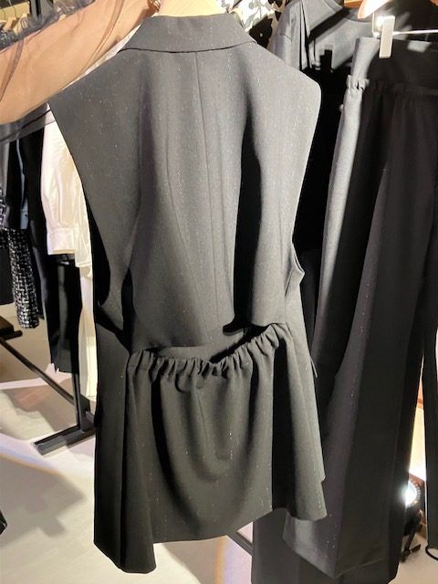 襟元とボタンが印象的なラメストライプ柄のジレは、背中あきでバックスタイルにひと癖あるデザイン。ワンピースタイプのジレもバックスタイルが凝ったデザイン。まるでジャンパースカートを着ているかのように見えて素敵でした。