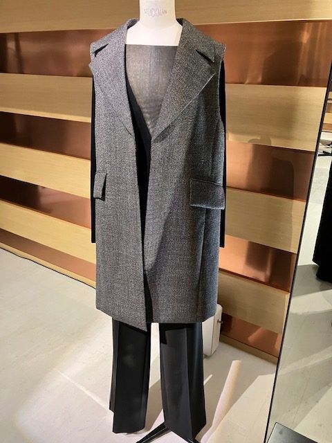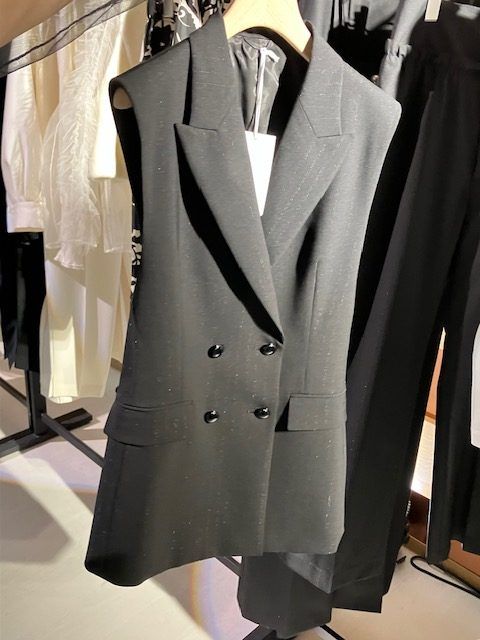 ロング丈でボタンレスのデザインのジレはシンプルだけど雰囲気が出る万能なアイテム。同素材のパンツとあわせてセットアップにするのも◎。モード感を漂わせる直線的なデザインが印象的。ジレは、今期はシアー素材のブラウスと合わせるとトレンド感もあり、女性らしい着こなしが叶います。