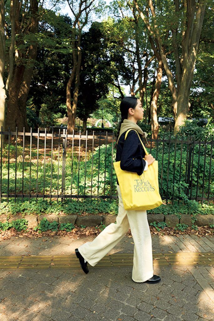 ユニークな音楽作品を取り扱う兵庫・加西のレコードショップ『Tobira Records』。オリジナルのトートバッグは、ロゴが大胆に配された存在感ある仕上がり。写真のイエローほか、全12色のバリエーションを揃え、どれも絶妙なカラーリングで何色か持っておきたくなる。大きさはレコードが30枚入るほどの大容量で、グローサリーバッグとしても使いやすい。¥2,380(トビラレコーズ tobirarecs@gmail.com) スカーフ¥12,100(MHL. 03‒5785‒6445) デニムジャケット、ロングスリーブTシャツはp.9、デニムパンツ、シューズはp.11で紹介。