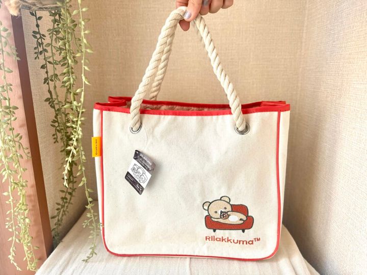 グレー、ベージュ、ネイビーの3色の中から好きな色を選べる「オリジナルパイピングバッグ」。筆者は紅白を思わせるベージュにしてみました! キャンバス生地に、ソファーに寝転びながらドーナツを食べるリラックマの刺繍とパイピングがよく映えています。持ち手のロープハンドルもデザインのアクセントに♪