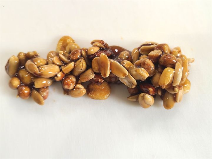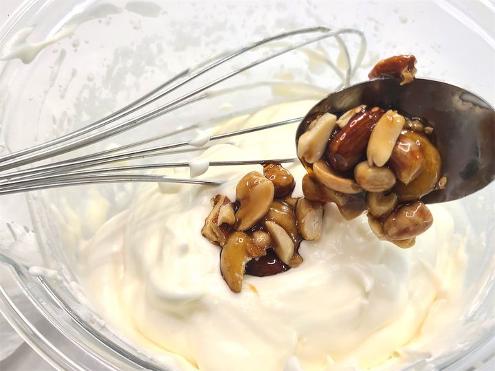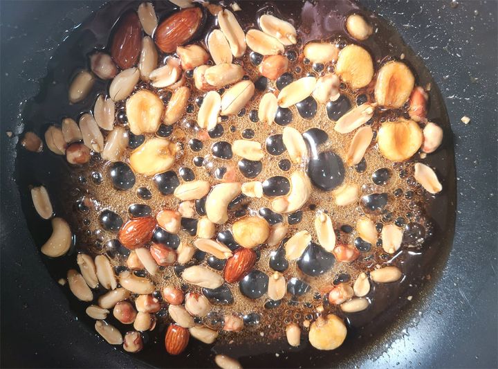 1. 砂糖大さじ5と水をフライパンでキャラメル色になるまで煮詰めたら、ミックスナッツ類を入れてキャラメルに絡ませ、冷ましておきます。冷めたら粗く刻んでおきます。