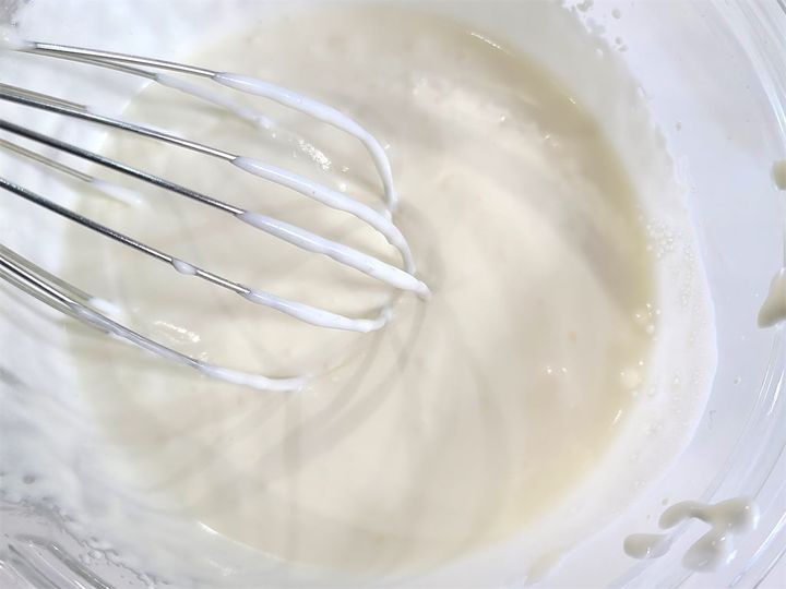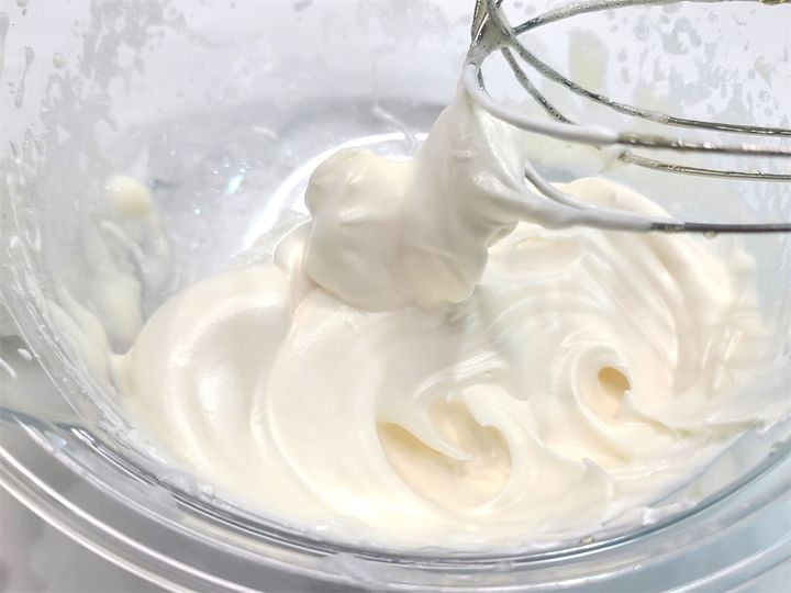 2. ボウルに生クリームと砂糖大さじ1を入れ、ハンドミキサーで固くならない程度に混ぜます。