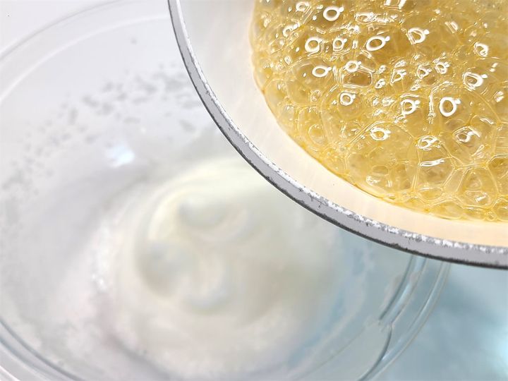 4. 3に沸騰するまで煮詰めた蜂蜜を混ぜながら加えます。角が立つまでしっかり泡立てましょう。