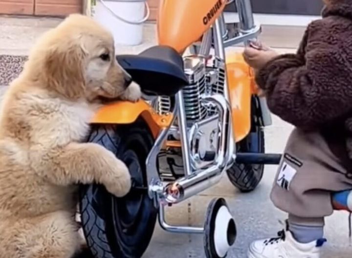 バイクのお手入れをお手伝い! 子犬と子どもの遊ぶ姿がとっても可愛い♡