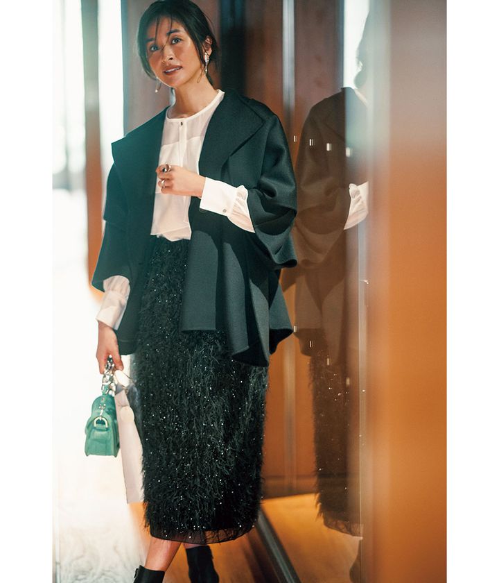 ストール付きコート¥154,000(デパリエ/デパリエ 伊勢丹新宿店)ブラウス¥31,900(アナイ)スカート¥36,300(アルアバイル)バッグ¥152,900(ピエール アルディ/ピエール アルディ 東京)ブーツ¥26,950(アンタイトル)ピアス¥33,000(ブランイリス/ブランイリス トーキョー)リング[薬指]¥17,200(vihod/ロードス)リング[人さし指]¥7,150(loni)