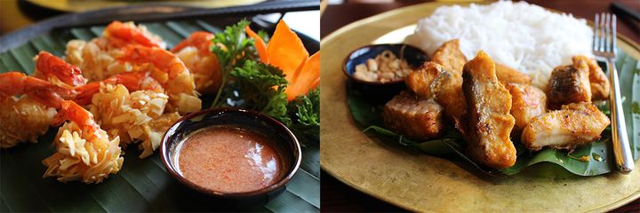 おすすめは、アーモンドを付けて揚げた車エビのフライと、魚のグリルと一緒に食べるライスヌードル。多くの料理に別添えのソースが付いてきましたが、やさしい味わいでどれも日本人の口に合う料理でした。