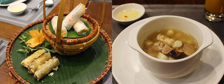 ベトナム料理の人気メニュー「生春巻&揚げ春巻」や、ハノイでは定番の食材・蓮の実が入った「鶏のスープ」などを堪能しました。初めて食べた蓮の実は、サトイモやカボチャに似たホクッとした食感。シンプルな味付けで、素材の味わいを感じられるメニューが多くありました。