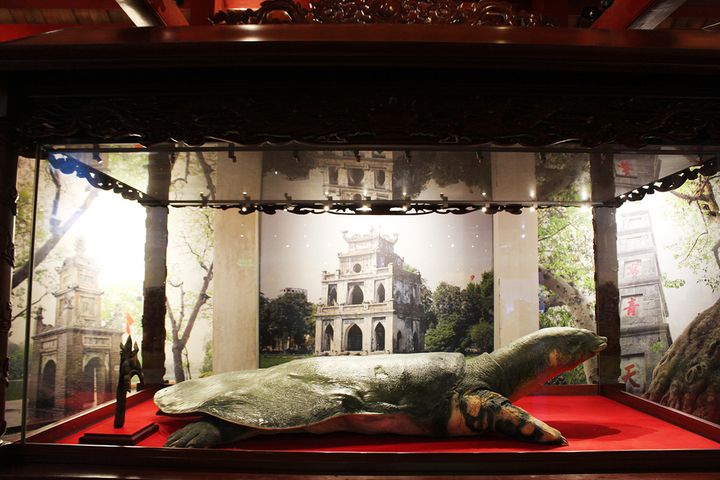 寺で展示されているのは、1968年にホアンキエム湖で捕獲されたという体長約2mの大亀のはく製! 亀は神の遣いとされ、かつてレー・ロイ王が中国軍を破った神剣を、大亀を通じて神に還したという伝説があるそう。このはく製は、その伝説に関わりがあるといわれています。