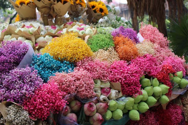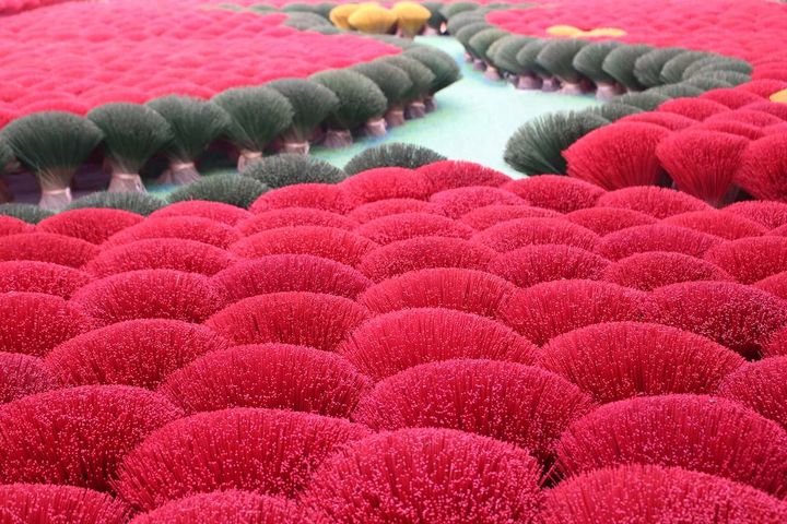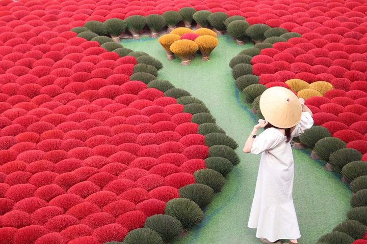 ここは100年以上前から線香作りが盛んな地区。線香作りの際には竹ひご部分を染色した後に、束にして乾かす作業が必要になります。そのカラフルな線香の束が広範囲に置かれていることから、まるで花畑のようなフォトジェニックスポットとなっているんです。