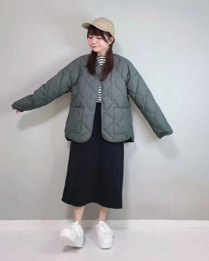 そんなオリーブカラーには、キャップをオンするのがおすすめ。洗練されたカジュアルさに遊び心をプラスできますよ。コクーンシルエットなので、カジュアルになりすぎないのも魅力のひとつ♡スカートとスニーカーの組み合わせで、カジュアルフェミニンに攻めてみて!