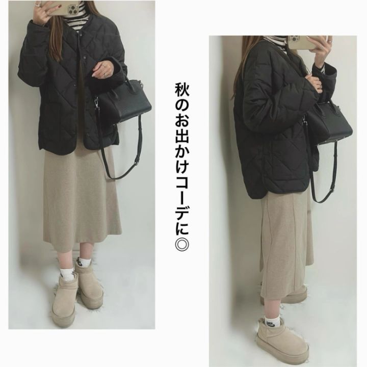 パフテックリラックスジャケットは、ニットワンピとの相性も◎すっきりとしたシルエットのワンピの上に羽織ることで、バランスよくまとまります。ニットワンピの優しい雰囲気とジャケットのキュートなコクーンの形が絶妙にマッチ。バッグをジャケットのカラーに合わせると、より統一感がアップしますよ♡