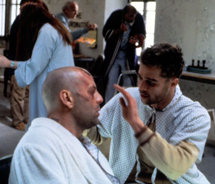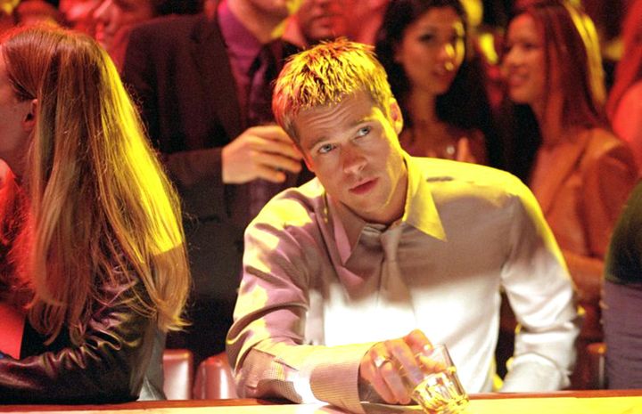 デヴィッド・フィンチャーとの2度目のタッグとなった『ファイト・クラブ』で演じたタイラー・ダーデンは、間違いなくブラッド・ピットの最もアイコニックで認知度の高い役と言っていいだろう。生きる意味が見いだせずに不眠症に陥っていた主人公の〈僕〉(エドワード・ノートン)が、偶然出会ったタイラー・ダーデンという男と殴り合いをすることで(実際には殴られることで)、生きる価値や喜びを手に入れ、ついには同じ喜びを求める男たちが集結して「ファイト・クラブ」という名の地下格闘サークル格闘を結成。しかし、やがてクラブは過激化していく……。カリスマ的な魅力の持ち主ながら、正気か狂気か分からない危険度マックスのブラピが、強烈なパフォーマンスを見せる。