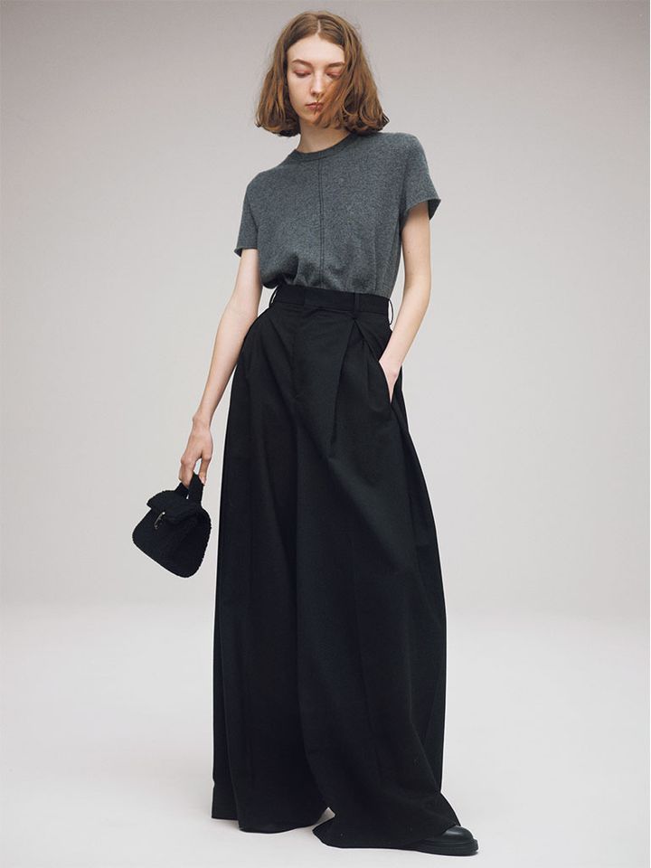 【POINT】それだけでさまになる黒という色で、下手なテクニックが要らないような、方向性が定まるデザイン。自然とメリハリがつくから、トップスはコンパクトな無地Tだけで目にとまるたたずまいが完成。