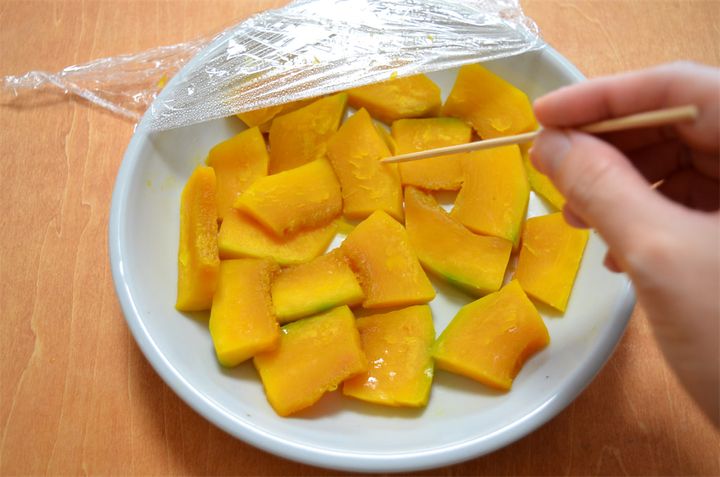 2. かぼちゃはワタと種を取って皮を剥き、小さめに切る。耐熱皿に乗せラップをかけて、600Wの電子レンジで約3分、軟らかくなるまで加熱する。