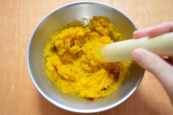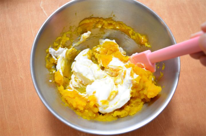 3. 軟らかくなったかぼちゃをつぶし、1の水切りヨーグルト大さじ2を入れて混ぜてなじませる。