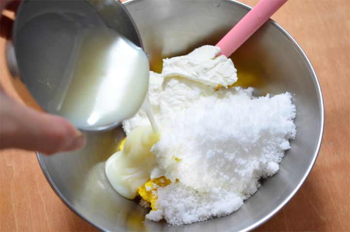 4. 残りのヨーグルト、砂糖(45g)、コンデンスミルクを加えて混ぜ合わせる。