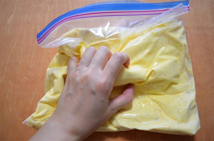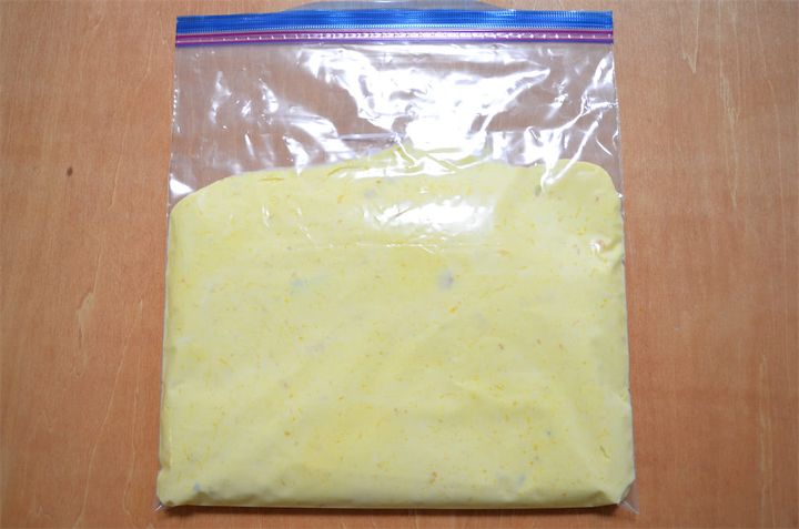6. 45の生クリームを2~3回に分けて入れる。全体が混ざったら丈夫な袋(ジッパー付きビニール袋など)に入れ、冷凍庫で2時間ほど凍らせる。