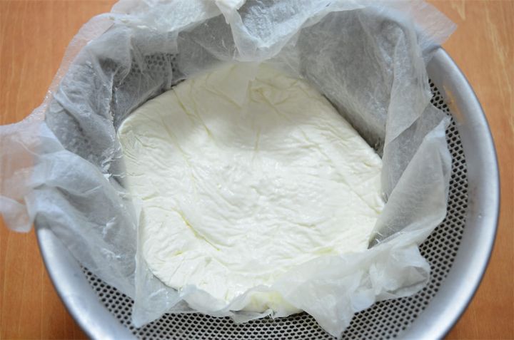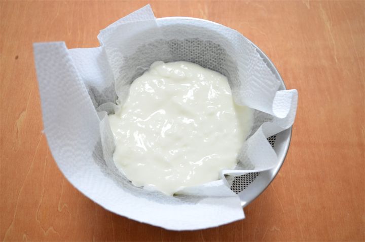 1. ザルにクッキングペーパーを敷き、ヨーグルトを入れてラップをかけ、冷蔵庫で一晩おいて水気を切る。