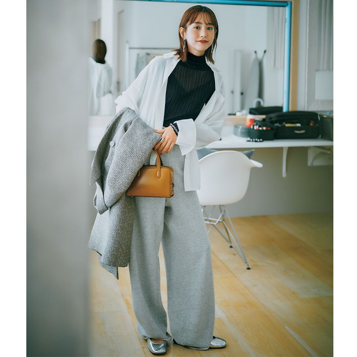 黒タートル+スウェットのメンズっぽいコーデには、バッグ、靴でツヤを足して洗練感をUP。アンクレイヴのニットのほんのり透け感もスウェットコーデのアップデートに一役。